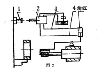 圖2是內圓磨砂輪主軸可在砂輪進入工件內孔進行磨削時防護罩自動抬起,在砂輪退出后防護罩自動下落將砂輪罩住的液壓系統(tǒng)控制的防護罩示意圖:液壓開關2與砂輪架一起向左運動,碰塊1頂開液壓開關2壓力油自油路3進入油缸上方,油路4與回油路接通,砂輪防護罩抬起,砂輪罩向右運動,液壓開關2離開碰塊1壓力油從路4進入油缸下部,砂輪罩將砂輪罩住。